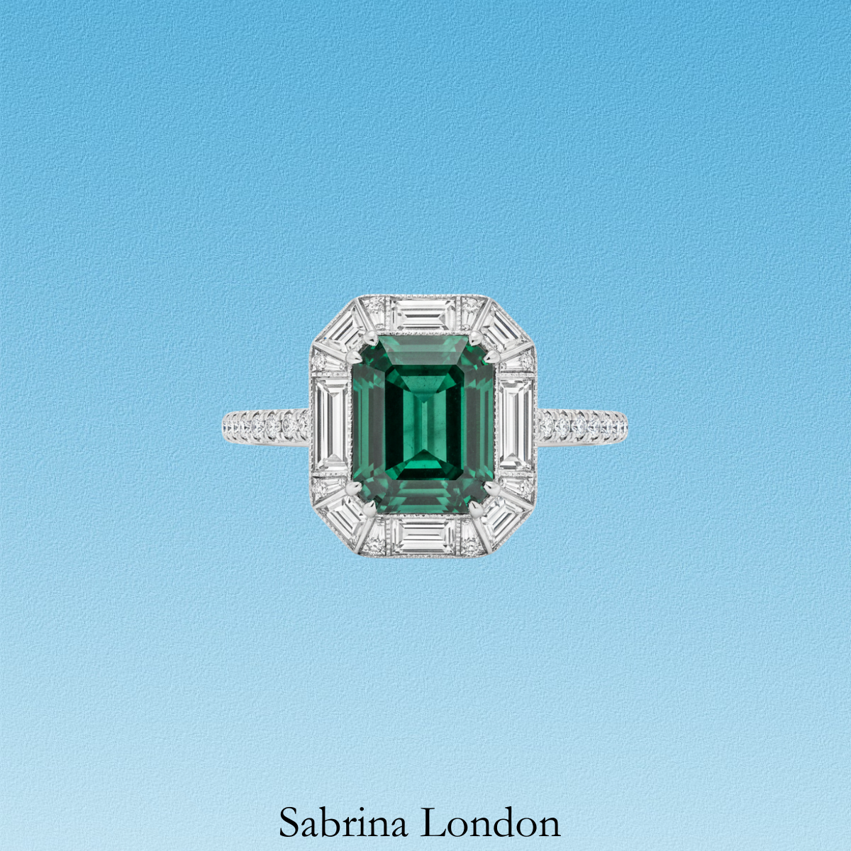 Sabrina London’s emerald-cut emerald ring showcases a striking emerald-cut green emerald with exceptional clarity and saturation as the centerpiece. The main stone is encircled by a geometric halo of trapeze diamonds, and the white gold band is pavé-set with round brilliant-cut diamonds. This ring exudes bold elegance, perfect for both formal occasions and everyday luxury stacking.