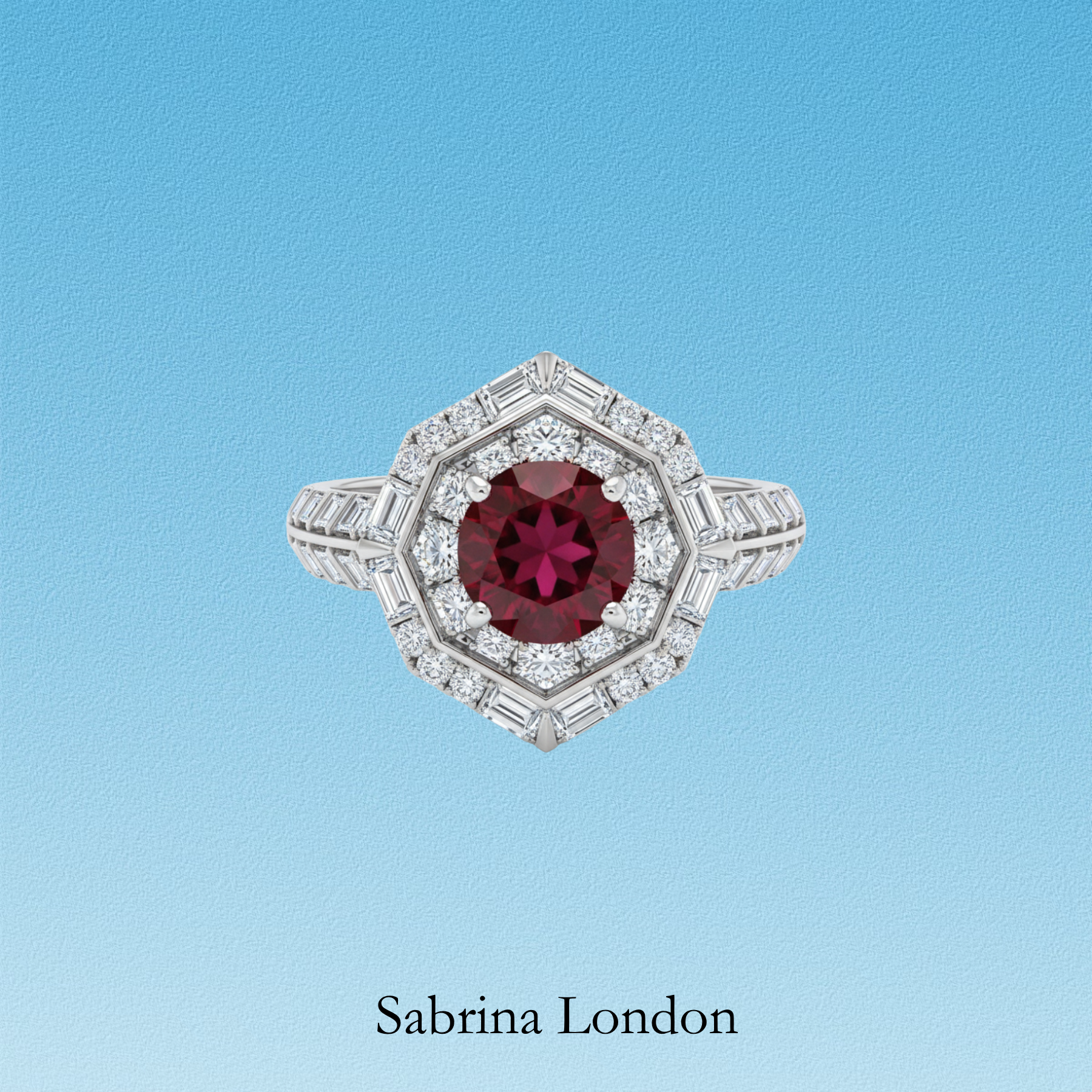 Sabrina London’s cocktail ring centers on a deep crimson round-cut garnet, framed by double halos of round and baguette diamonds in white gold. Its hexagonal diamond border brings architectural flair, blending rich gem color with dazzling diamond sparkle—crafted in London for bold, sophisticated evening elegance.