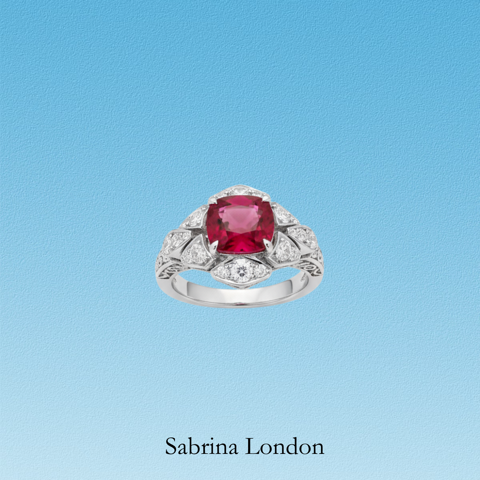 Sabrina London’s ruby cocktail ring is anchored by a cushion-cut Burmese ruby with a lush, deep red tone, encircled by round brilliant diamonds in a floral-inspired white gold mount. Intricate diamond pavé on the band adds extra sparkle, while the handcrafted metalwork reflects the brand’s fine jewelry expertise—an eye-catching statement piece ideal for elevating special event looks.